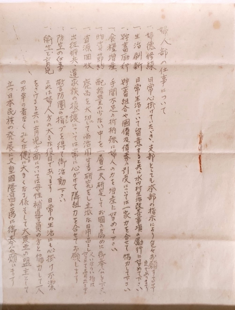 国防婦人会は、1932(昭和7)年に大阪で結成された婦人団体で、会員が割烹着姿で兵士の送迎や慰問状の送付などの銃後の活動をしました。戦争協力と思想統制をねらいとする軍部の力を背景に大日本国防婦人会となると、瞬く間に会員を増やし、1941(昭和16)年には全国に支部、分会をおく1000万人規模の組織となりました。当館で整理中の水内村(現長野市信州新町)北原家文書(上條信彦氏収集文書)の中にも、水内村国防婦人会関係の資料が見られます。この資料は1936(昭和11)年の大日本国防婦人会水内村分会創立総会開催に関わる資料です。当日会員は「白エプロンヲ着用シ其ノ上ニ右肩ヨリ左脇下へ襷章ヲ掛ケテ出席」とあります。ただ、襷章がまだ配布されていない区については到着次第配布するとされており、結成直後の慌ただしさが感じられます。