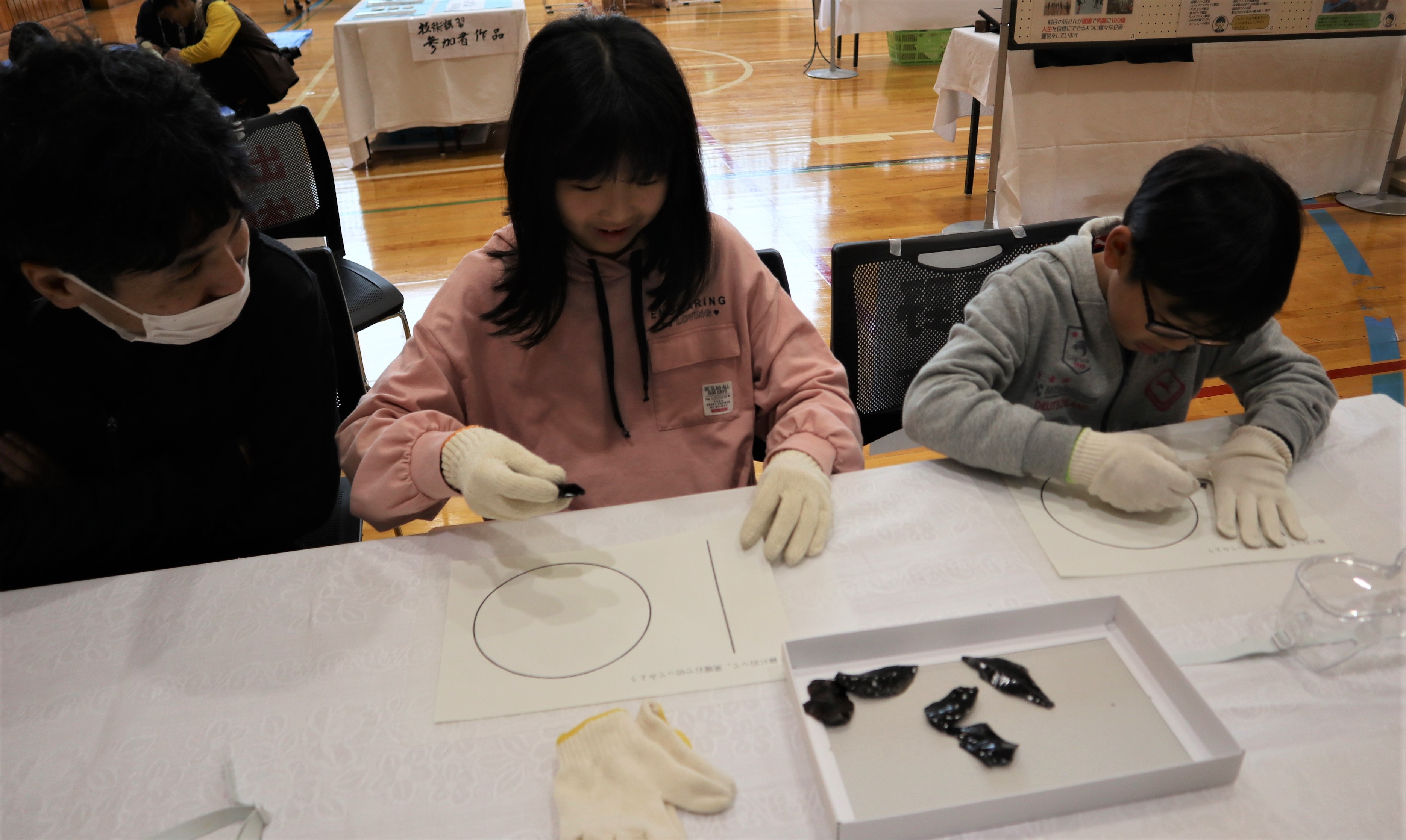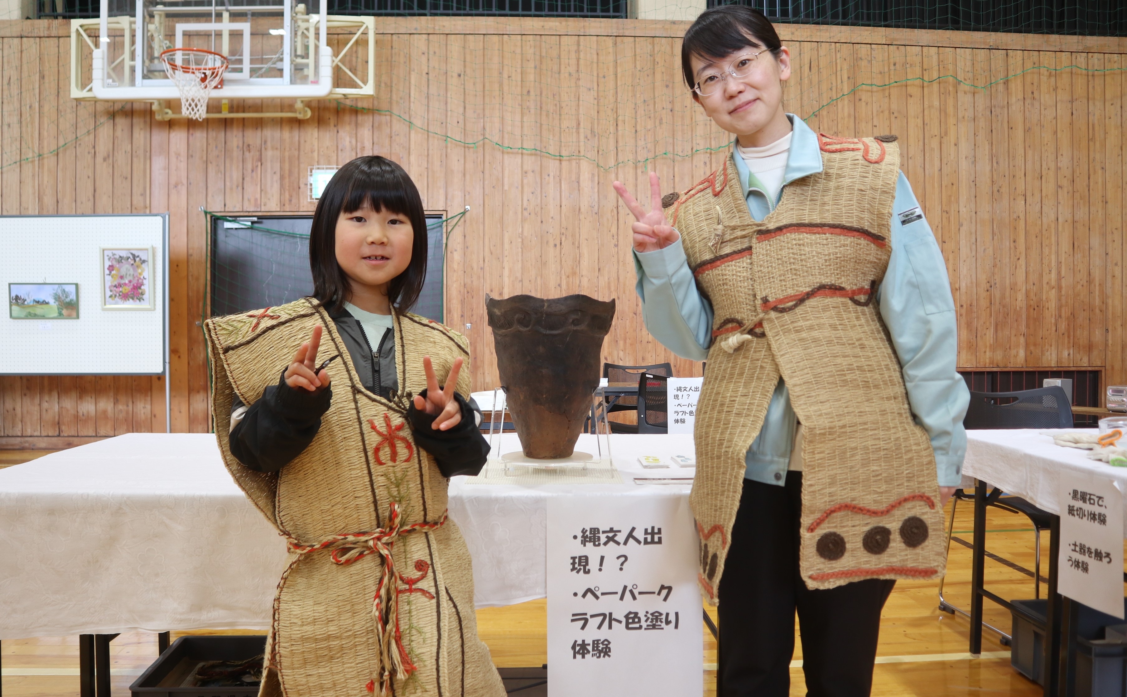 お出かけ歴史館のご報告!! 10月26日(日)、「お出かけ歴史館」を行いました。9月2日(金)の阿南第一中学校に続き、本年度2回目になります。今回は、木祖村さんのお声がけにより「木祖村文化祭」で行いました。 地元の小学生や中学生を始め、木祖村のみなさん、約120名に楽しんでいただきました。 文化祭では、書道や絵画、陶芸作品などの展示のほか、長野県伝統工芸品であるお六(ろく)櫛(ぐし)の製作実演もありました。歴史館では、黒曜石片を使っての紙切り体験や縄文土器に触れたり、持ってみたりする体験、復元した縄文衣服を着用する体験などを味わっていただきました。 「歴史館には出かけたことがない」との方々も、「貴重な体験ができて面白かった」「北信の土器と木祖村の土器のちがいに興味をもった」など、たくさんの好評をいただきました。これを機会に木祖村から当館は少し遠いかもしれませんが、お出かけいただければ幸いです。一同、お待ちしております。 当館ではこのような、「お出かけ歴史館」事業をおこなっております。ぜひ、南信・木曽地域のみなさま、ご利用ください! 本当に紙が切れちゃう! 縄文人になりきって 熱心に体験してくれました!