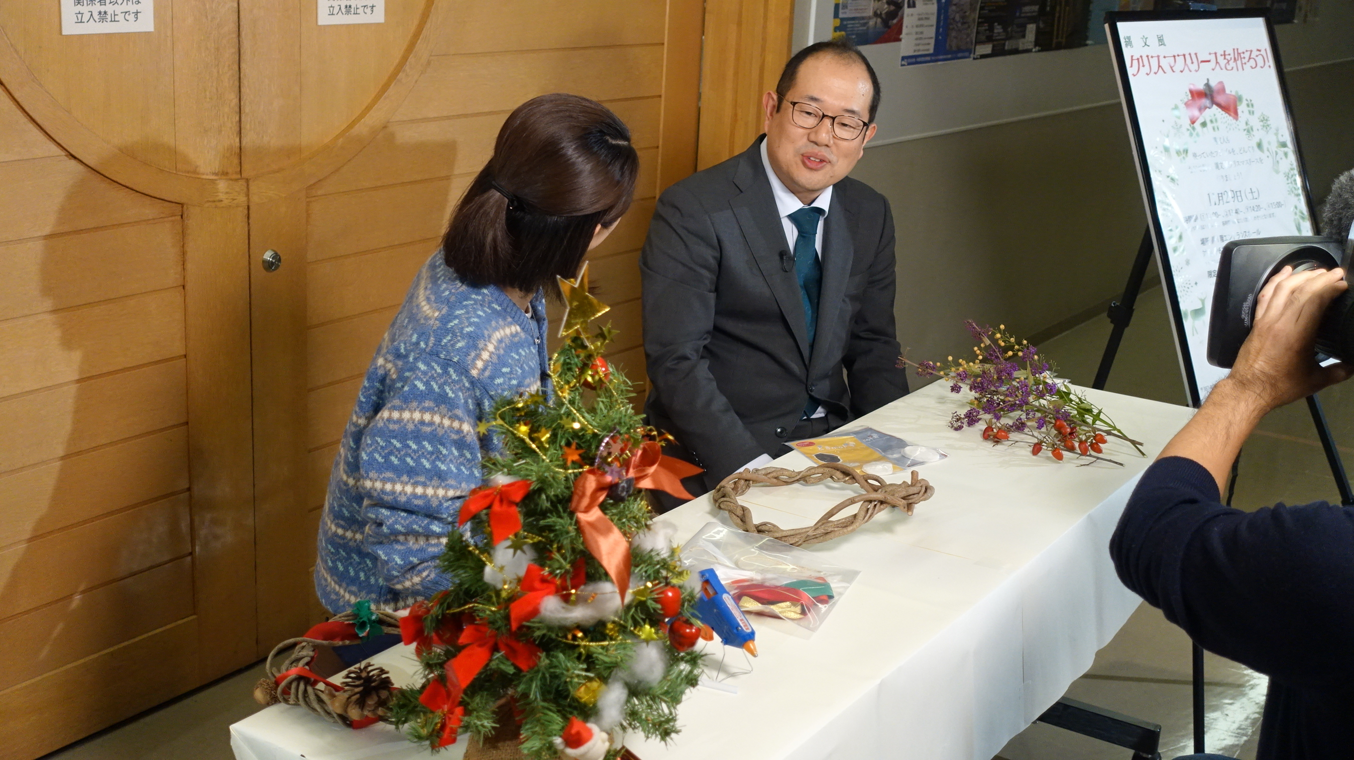 当館のクリスマスリースは特別で、縄文人が使っていたフジヅルでできた土台に、縄文人が食べていたどんぐりなどで飾り付けるので「縄文風クリスマスリース」と名付けています。