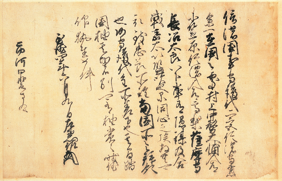 | 説明 | 弟の義種に替わって信濃国守護となった管領斯波義将が、市河頼房に対して、将軍足利義満の命として、信濃守護代に加勢し忠節を尽くすよう命じた御教書。至徳4年9月市河頼房軍忠状(118)により、村上頼国、小笠原清順、高梨朝高、長沼(島津)太郎らが反守護の兵を挙げ平柴(長野市)の守護所を襲い、守護代二宮氏泰の子種氏が率いる守護方と合戦に及んだことが知られる。本文書から守護所をめぐる攻防の直後にあたる時期に、事態を重くみた幕府がとった対応の一環をうかがうことができる。 |