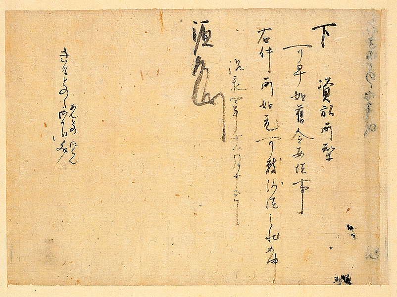 | 説明 | 木曽(源)義仲は治承4年(1180)9月に平氏打倒の挙兵をおこなう。本文書はその2カ月後に義仲が藤原(中野)助弘に対し、従来どおり、その所領を安堵した(支配することを認めた)下文である。木曽義仲の自筆花押があるものとして、現在知られている唯一の文書である。 |