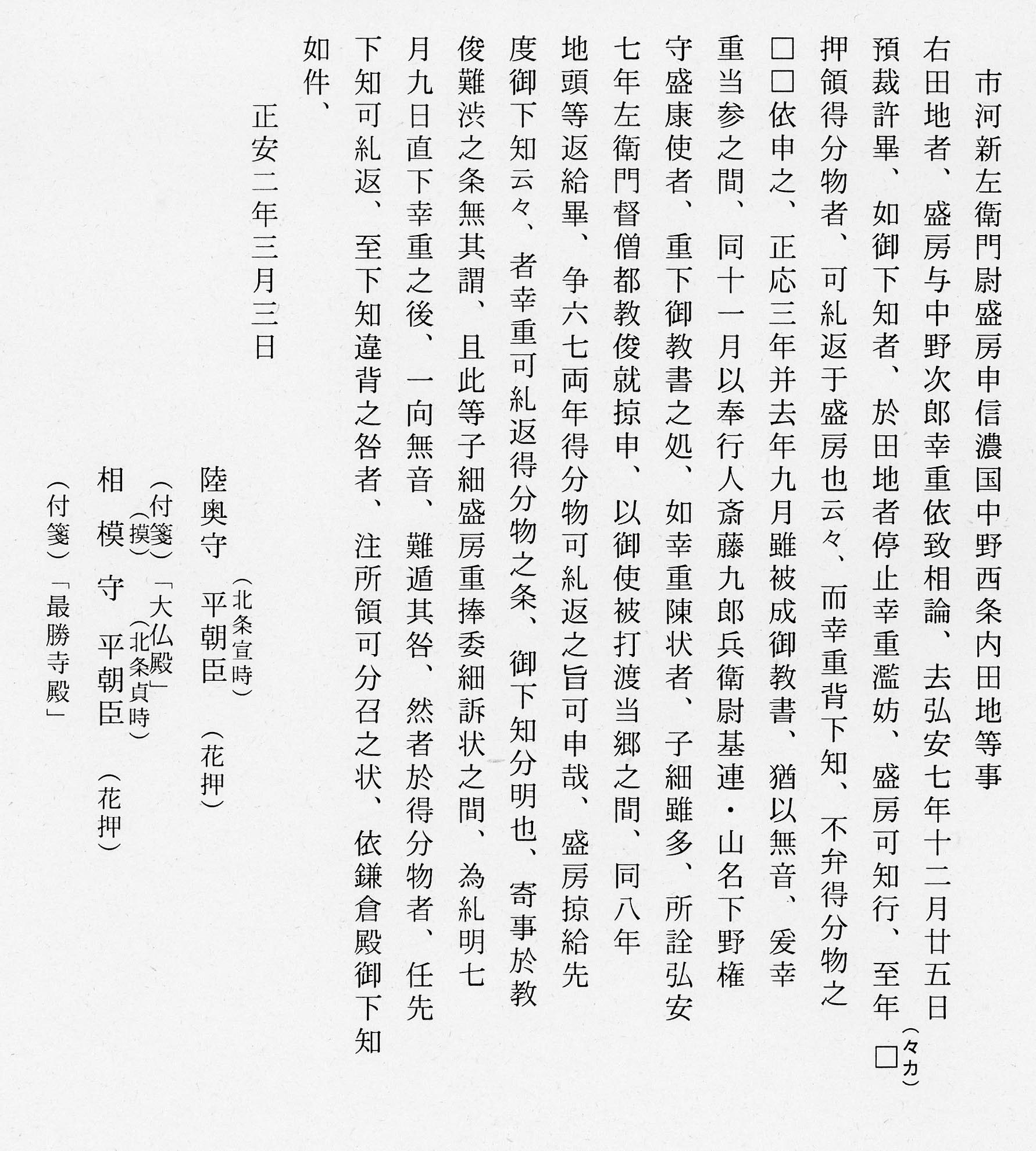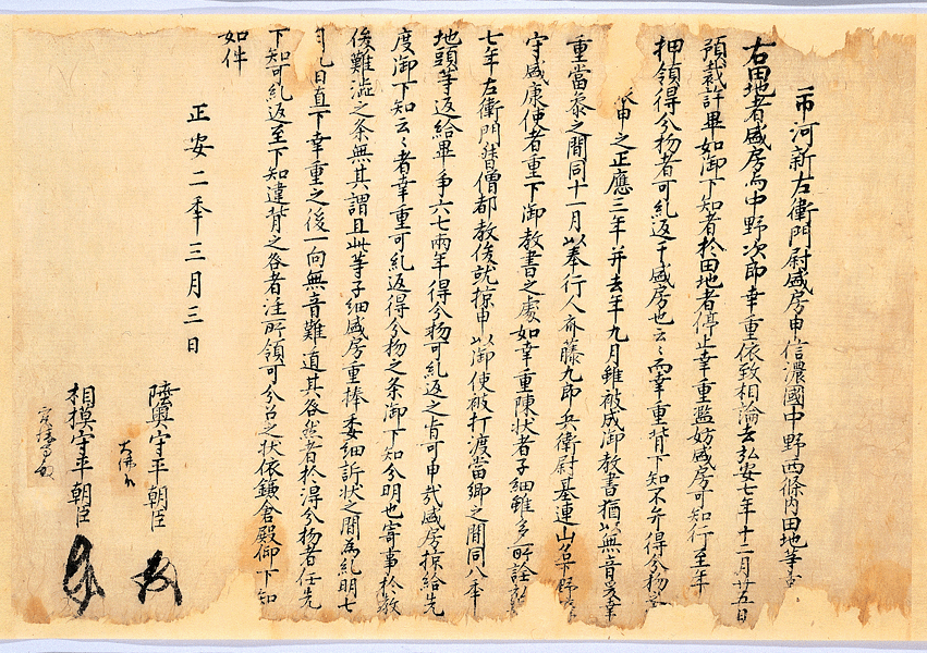 | 説明 | 中野幸重に対して、弘安7年(1285)12月25日の下知にしたがうことと、下知に背いた罪として所領の一部を召し上げることを命じた下知状。中野幸重と市河盛房は中野郷西条内田地をめぐって相論となったが、弘安7年の幕府裁定により、同地は市河盛房の知行とされ、中野幸重には押領した得分物の返済が命じられた。その後、幸重が下知に一向に従わず、再三の幕府の命にもかかわらず得分物の返済を行わないため本文書の処断が下された。 |
