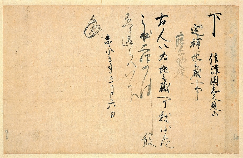 | 説明 | 寿永2年(1183)下文(003)と同じく、源頼朝(鎌倉殿)の命をうけて、醍醐禅師全成が藤原(中野)助弘を高井郡志久見山地主職に任じた下文である。2カ月前の寿永3年1月に義仲は討死しており、頼朝の支配が一段と信濃国北部に浸透していったと考えられる。志久見山とは志久見郷をさし、現在の下高井野沢温泉村と下水内郡栄村にあたる。また、地主とは山野を開発し、土地を私有した開発領主をさす。 |