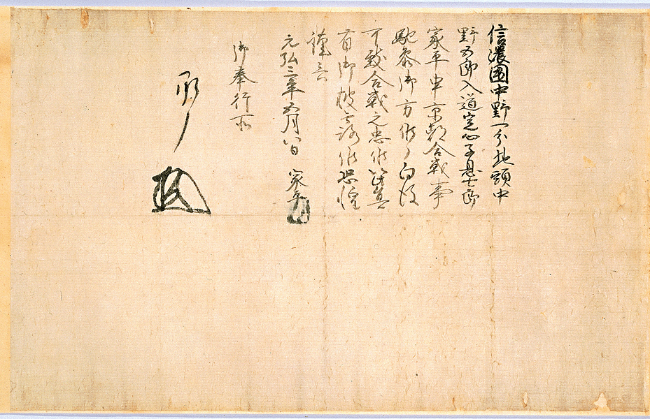 | 説明 | 中野家平が、京都合戦に際して足利高氏方として参陣したことを上申し、足利高氏から証判を得た着到状。中野家平は中野郷の一分地頭(郷全体の地頭ではなく、郷の一部を知行していた地頭)である中野定心の子。京都合戦は足利高氏らが鎌倉幕府の六波羅探題を攻め滅ぼした戦い。同日の参陣については元弘3年5月14日付けの中野家平着到状(044)も残る。 |
