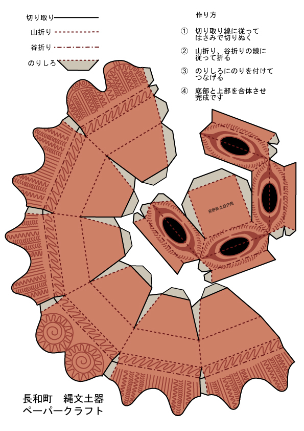長和町(ながわまち)縄文(じょうもん)土器(どき)6面(めん) 作(つく)り方(かた) 切(き)り取(と)り線(せん)に従(したが)ってはさみで切(き)りぬく 山(やま)折(お)り、谷(たに)折(お)りの線(せん)に従(したが)って折(お)る のりしろにのりを付(つ)けてつなげる 底部(ていぶ)と上部(じょうぶ)を合体(がったい)させたら完成(かんせい)です! ダウンロード いちらんにもどる